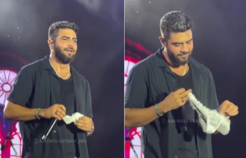 Henrique, da dupla com Juliano, foi surpreendido em show em Aracajú ao receber uma calcinha de presente enquanto se apresentava