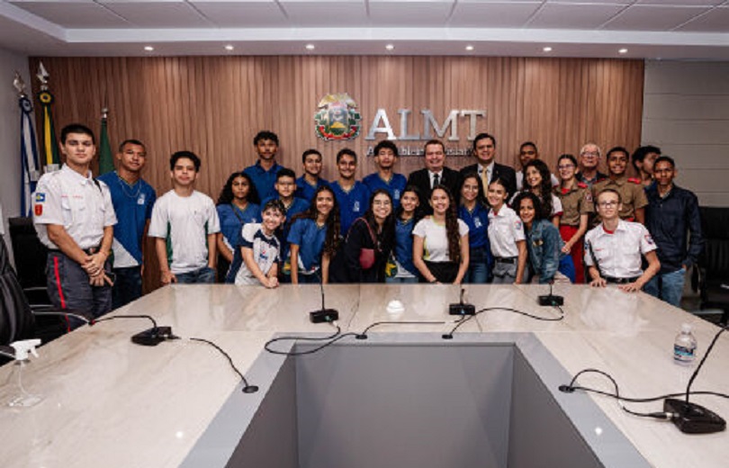 O presidente da ALMT, Max Russi (PSB), e o deputado Thiago Silva (MDB) se reuniram com os estudantes na sala do Colégio de Líderes, nesta quarta (26)