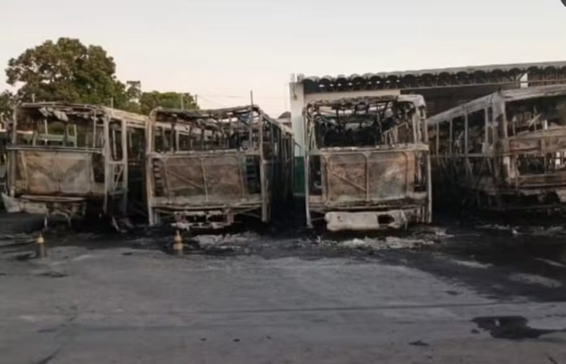 Seis ônibus são atingidos por incêndio em pátio de empresa de transporte em Cuiabá
