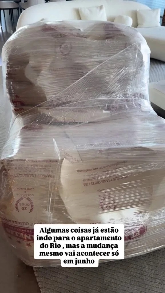 “Começando aos poucoas a levar as coisas para o Rio de Janeiro”, legendou a loira nos Stories do Instagram. Parte da mudança ocorre devido ao novo cargo do seu marido, o jornalista César Tralli, que agora é âncora do Jornal Nacional, da TV Globo. O telejornal é gravado nos estúdios principais da emissora, na capital carioca.