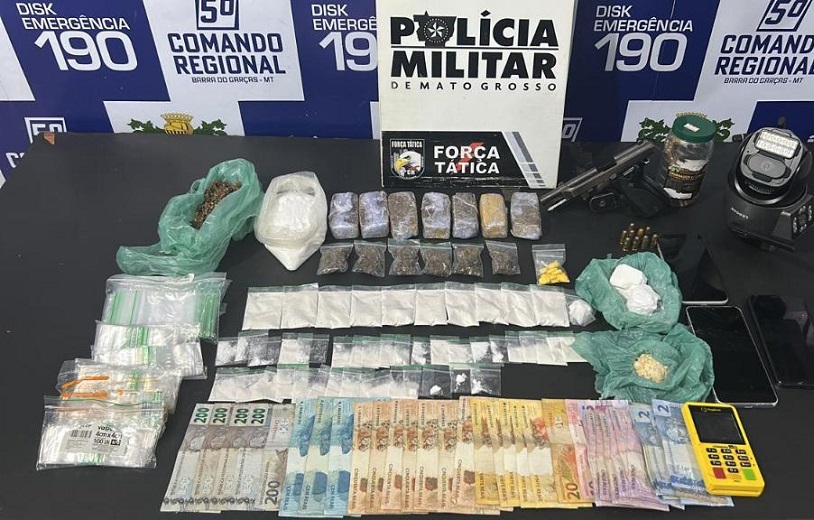 A equipe se deslocou até o endereço e, durante buscas no interior do imóvel, foram encontradas mais 12 porções de cocaína, 14 porções de pasta base e 17 porções de maconha, além de R$ 9 em dinheiro.