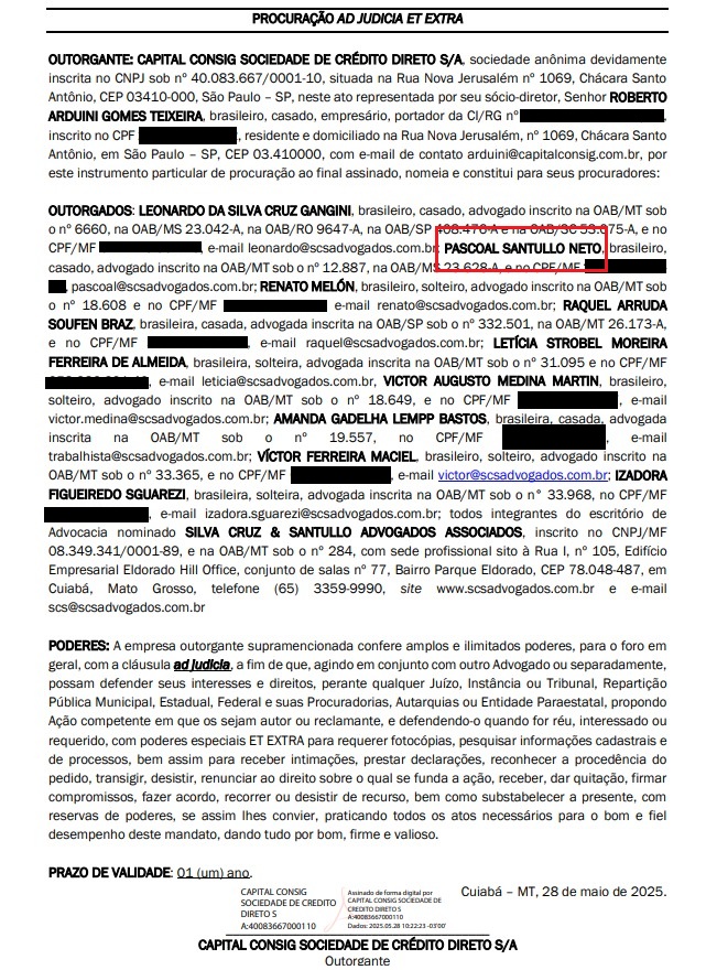 Confira a procuração que atesta que Pascoal Santullo está defendendo a Capital Consig: