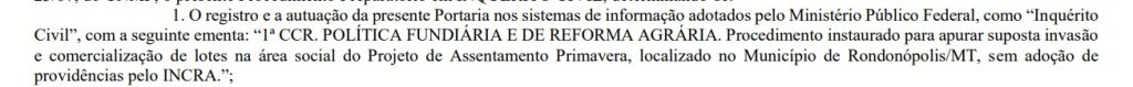 O Ministério Público Federal (MPF) abriu uma investigação para apurar vendas de lotes de um assentamento no município de Rondonópolis (MT), distante 214 quilômetros de Cuiabá. A medida foi publicada no Diário Oficial do órgão nesta quarta-feira, 17. De acordo com o MPF, o Procedimento Preparatório relata suposta invasão e comercialização de lotes na área social do Projeto de Assentamento Primavera, localizado no município mato-grossense.
