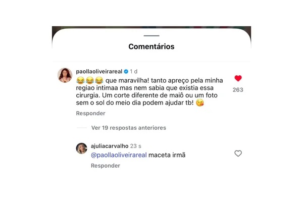 Com a repercussão, Paolla Oliveira decidiu se manifestar nos comentários da publicação. A atriz afirmou que desconhecia a existência do procedimento mencionado pela médica.