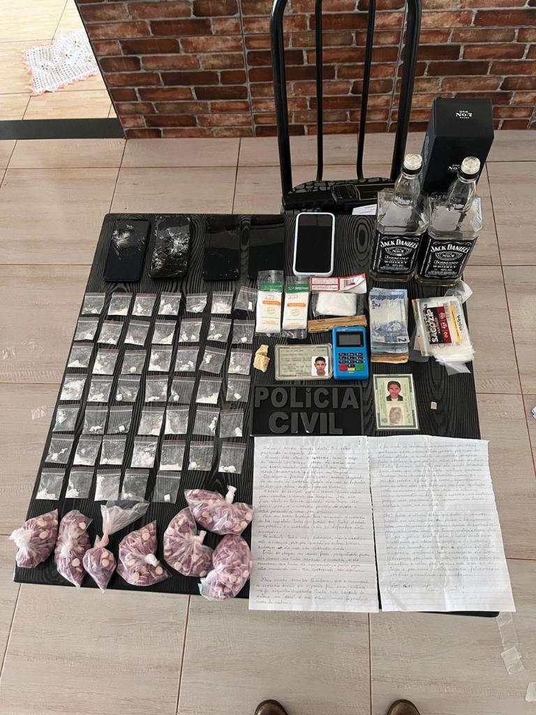 Além disso, foram apreendidos ainda uma máquina de cartão, duas garrafas de whisky e pacotes de papelotes para embalar drogas.