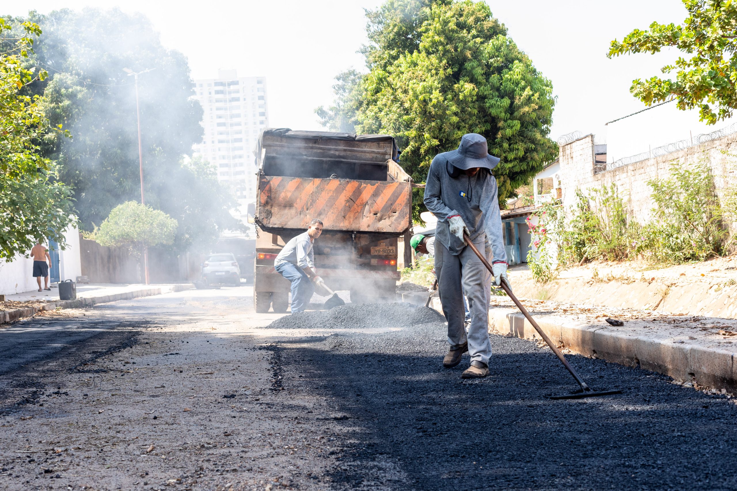 O processo envolve várias etapas, como secagem do solo com caminhão-pipa, limpeza com retroescavadeira, aplicação de brita e finalização com a camada de asfalto quente, que é nivelada e compactada. Todo o procedimento é fiscalizado por técnicos da SMOP, que acompanham desde a preparação da base até a entrega final da via.