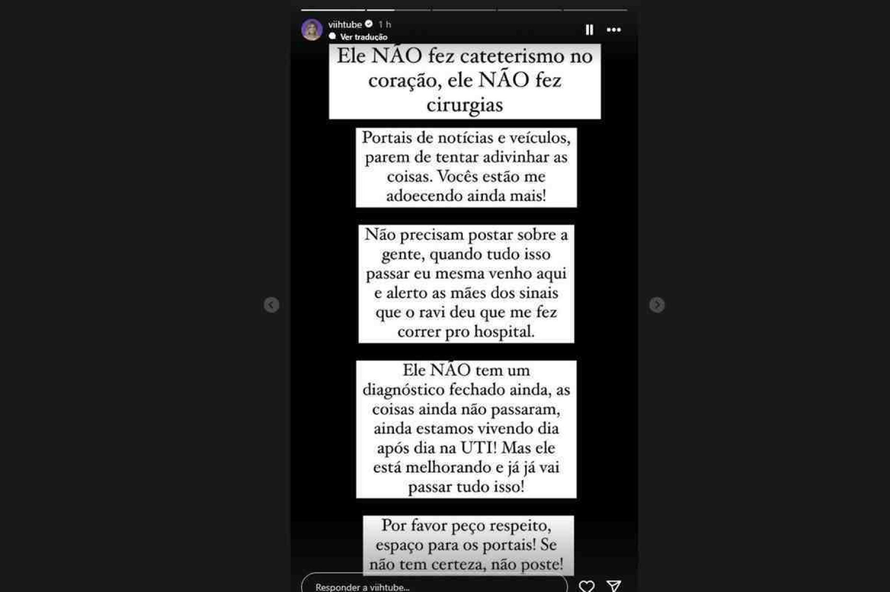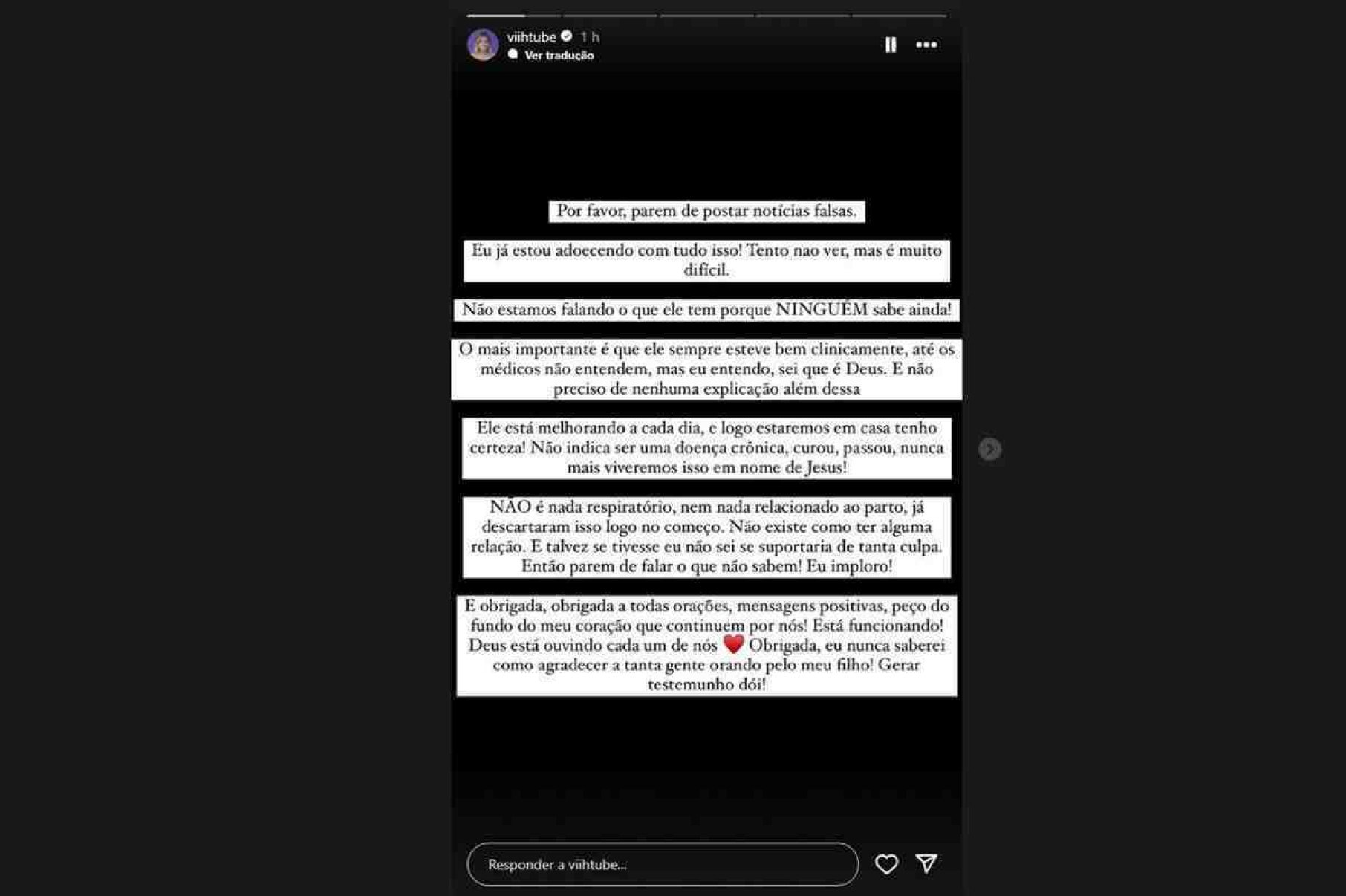 Viih também explicou que não informou sobre o quadro de Ravi pois os médicos ainda não deram diagnóstico. “Não estamos falando o que ele tem porque ninguém sabe ainda. O mais importante é que ele sempre esteve bem clinicamente, até os médicos não entendem, mas eu entendo, sei que é Deus”, esclareceu.